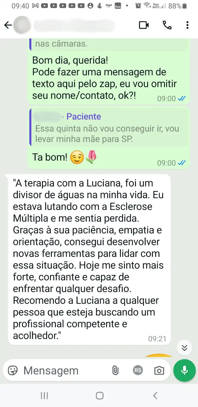 Seu relato foi um bálsamo, uma grande inspiração naquele momento tão difícil da minha vida! Eu não tinha condições de ir para a Índia e fazer o tratamento Ayurvédico que ela fez, mas eu acreditei na cura e encontrei outros caminhos.